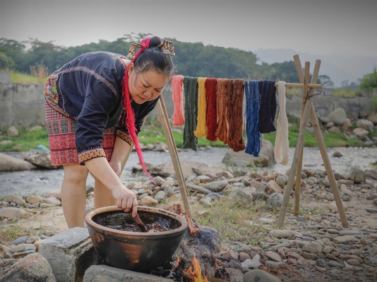 “与化学染色相比,植物染色也有优势,用植物染料染出来的颜色有类似于哑光色的呈现效果,看起来温润柔和、素雅稳重。”符玉说,以前在黎族村寨,染线与纺线、织锦一样,是黎族女子必须学会的技能,黎族妇女在女儿年少时就经常带她们上山,告诉她们哪种植物可以染什么颜色。在染线时,她们也会把女儿叫到身边,讲解染液制作要领、棉线浸泡时长、复染次数等知识。近几年,她跟着村里的阿婆在山上种植棉花,将棉絮纺成线,同时采集染料植物,体验古法染线的全过程,并将自己的纺染织绣技艺传授给女儿符慧莉。