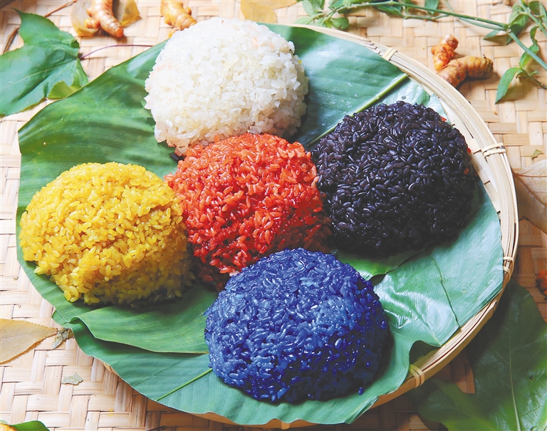 五色饭是海南苗族聚居区一种颇具特色的食物,一饭五色,软糯清香。2016年,苗族五色饭制作技艺入选五指山市非物质文化遗产名录,邓丽琴是这项非遗技艺的代表性传承人。