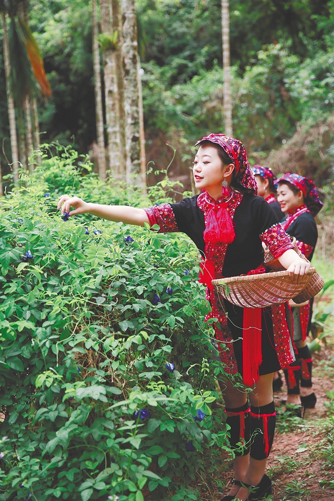 近日,海南日报记者刚走进五指山市南圣镇新春村,便听到了阵阵山歌声。“嗬咧呀……乌味哎……嗬咧呀……”在村边的一块田地里,头戴绣花方帕、腰束彩色长带的苗族妇女邓丽琴与女儿盘玥,一边高兴地唱着山歌,一边将采摘的染料植物红蓝草放进身后的竹篓里,为制作五色饭做准备。