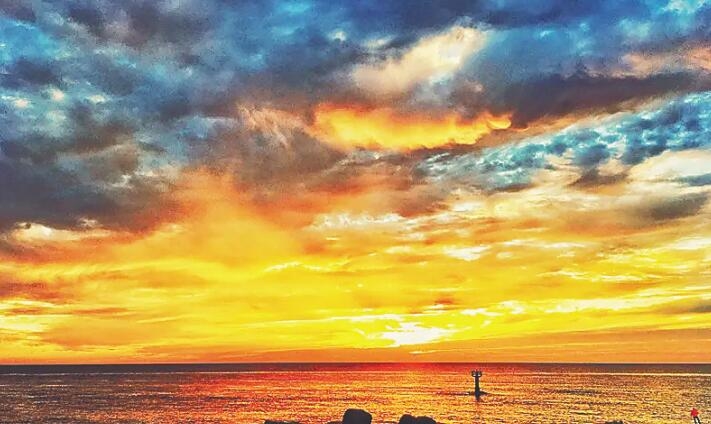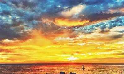 我随着身边一位游人手指的方向望去,这日落画面果然壮美!一轮红彤彤的夕阳向西边海面缓缓滑去,它像一个金灿灿的圆球,像一团火焰,像一颗红心鸡蛋,像一团炉中的钢水……偶尔,一丝丝云彩似有似无地从夕阳边飘过,天空被夕阳染成了血红色,天边“燃”起了熊熊烈火。海面彩霞流泻,波光粼粼,好比无数颗星星在闪烁。远处,渔船点点,仿佛是在斜阳的陪伴下满载而归。鸟儿在海面上盘旋,翅膀擦过晚霞,好一幅“落霞与孤鹜齐飞,秋水共长天一色”的图景;近处,海岸边的奇石、栈道、树林和度假村的楼房,都被夕阳橙红色的光晕笼罩着。多么奇妙的景观!