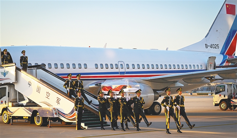 15时55分,载护江泽民同志遗体的专机缓缓降落。在低回的哀乐声中,12名礼兵抬护安放着江泽民同志遗体的灵柩,缓缓走下专机,行进至迎灵队伍正前方肃立。习近平等向江泽民同志遗体三鞠躬,目送灵柩上灵车。之后,治丧委员会办公室成员和江泽民同志亲属护送遗体前往停灵处。