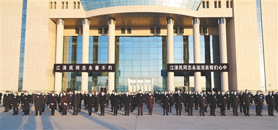 北京西郊机场国旗半垂,气氛庄严肃穆,黑底白字横幅上写着:“江泽民同志永垂不朽”“江泽民同志永远活在我们心中”。习近平和夫人彭丽媛等胸佩白花、臂戴黑纱,神情凝重地在停机坪肃立。