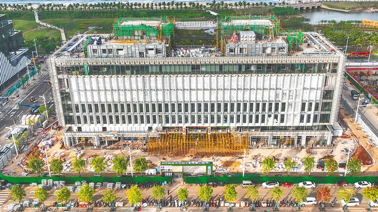 日前,位于海口江东新区总部经济区的鸿宝集团海南自贸港投资总部项目现场,工人加紧进行玻璃幕墙施工。目前,项目总体进展已完成超过80%,计划今年年底前整体完工。