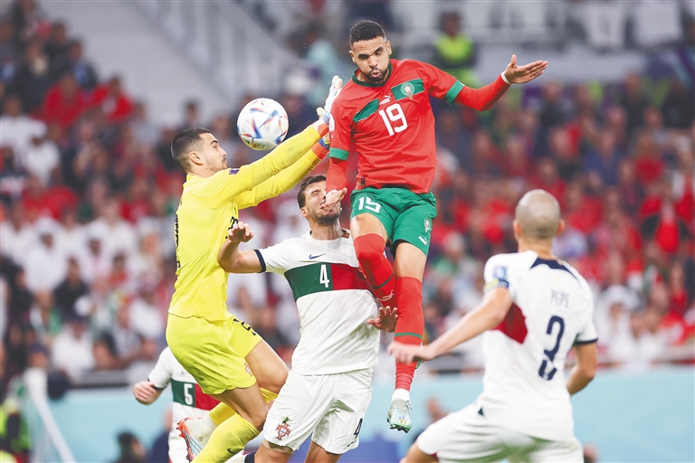 当日,在卡塔尔多哈阿图玛玛球场进行的2022卡塔尔世界杯足球赛四分之一决赛中,摩洛哥队1:0战胜葡萄牙队闯进四强。新华社发