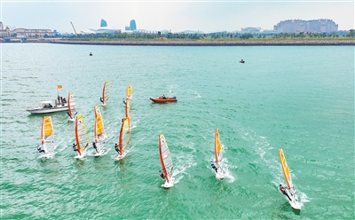 ②12月9日,在儋州市海花岛游艇码头附近海域举行的第六届省运会帆板帆船比赛现场,运动员扬起风帆在海上展开激烈角逐。