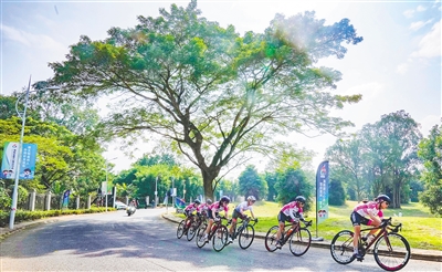 ①12月11日,海南省第六届运动会自行车比赛(公路赛)举行,共吸引海口、儋州等7个市县的代表队参加。图为选手在比赛中。