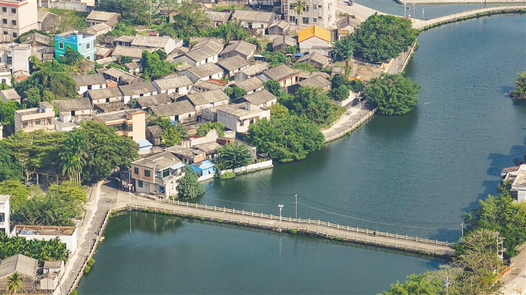 从海口主城区驱车往南30多公里便到了文山村,村口“文山古村”四个大字十分显眼。文山村毗邻南渡江,村前有文山塘如玉带般环绕,背靠山樵岭,村庄坐落于坡度较缓的火山地貌上,中部高、四周低,村中建筑物也随地势形成阶梯式高度差。从高处俯瞰,全村宛若一朵浮出水面的莲花,用山水交融来形容再合适不过。