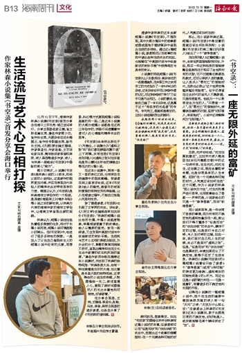 通读作家林森的这本全新短篇小说集《书空录》,不难发现,其中大部分篇目中的故事都或隐或显地于错综复杂中呈现出生活的多样性。通过这9篇短篇小说,读者既可以在故事的走向中读出各种生活状态的拉扯,也能够在“中高腔对话与中低音叙述的奇妙平衡”中获得笃定与具体的体认。