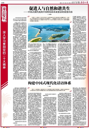 在党的二十大报告中,习近平总书记把人与自然和谐共生作为中国式现代化的重要内容之一,把促进人与自然和谐共生作为中国式现代化的本质要求之一。这既是新时代中国共产党人对社会主义现代化建设认识的深化和升华,也是新时代中国共产党人对生态文明建设认识的深化和升华,具有极其重要的实践意义和理论意义。