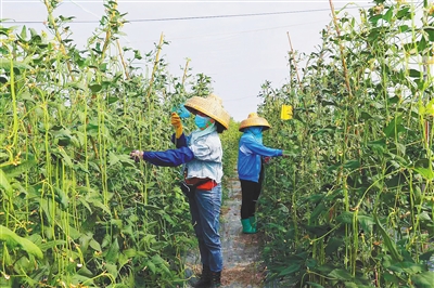 “如果是在露天种植的,这时候已经有蓟马、斑潜蝇发生了。但我们在防虫网棚里种植的,你看,目前还没发现斑潜蝇、蓟马的危害。”在利国镇新建田洋,乐三村委会支部书记容伟指着防虫网棚里种的豇豆说,“防虫网+”技术种植豇豆,农药使用少,亩产量比较高。