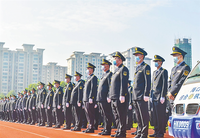 换装仪式上,全体执法人员身着新式制式服装,精神抖擞,意气风发,高举右手,庄严宣誓,一句句铿锵有力的誓词响彻广场:“坚决拥护中国共产党的领导,忠于宪法和法律,认真履行法定职责,严格依法行政,严守执法纪律,规范执法行为;坚持公正文明、廉洁自律、忠诚敬业,为推进法治政府建设和海南自由贸易港建设而努力奋斗。”