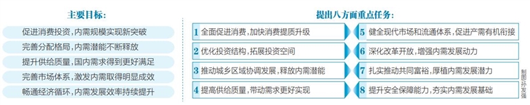 方案明确,“十四五”时期实施扩大内需战略的主要目标是:促进消费投资,内需规模实现新突破;完善分配格局,内需潜能不断释放;提升供给质量,国内需求得到更好满足;完善市场体系,激发内需取得明显成效;畅通经济循环,内需发展效率持续提升。