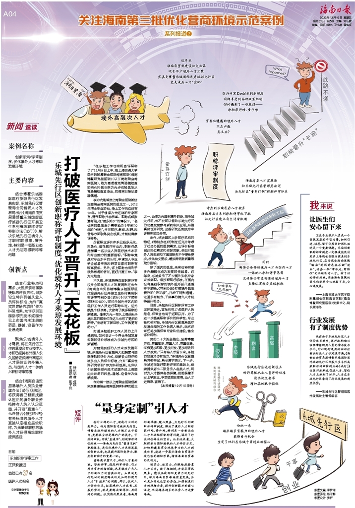 结合博鳌乐城国际医疗旅游先行区发展实际,乐城先行区管理局会同省委人才发展局出台《海南自由贸易港博鳌乐城国际医疗旅游先行区开展卫生系列高级职称评审特别办法(试行)》,解决乐城先行区境外人才职称取得难、晋升难,特别是一些新业态人才无法取得职称等问题