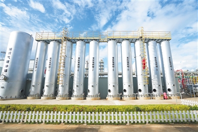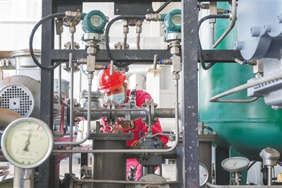 12月13日,在澄迈福山油田花场油气处理站,大小不一的银色储罐在绿色的草坪衬托下闪闪发光。处理站的上方,有序排列着许多高低错落的管道,管道的尽头连接着许多大小不一的储罐,伴随着“呼哧呼哧”的放压声音,罐内的二氧化碳与天然气完成分离,二氧化碳经过液化处理后通过管道运送至储罐内,等待被车辆拉走注入油田。