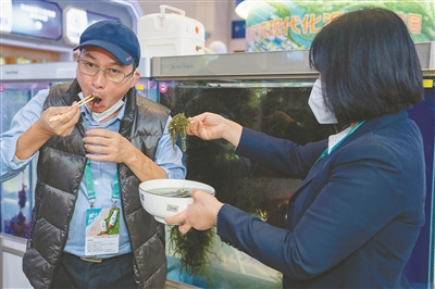 参展商品尝海葡萄。本报记者 袁琛 摄