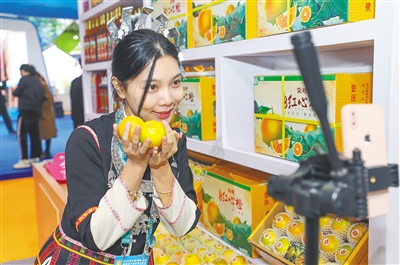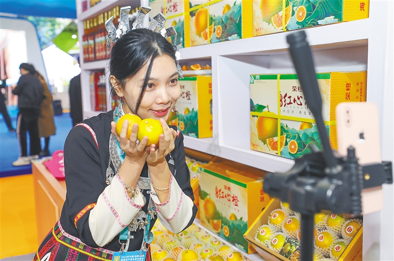 在冬交会白沙展区,工作人员直播推介产品。本报记者 李天平 摄