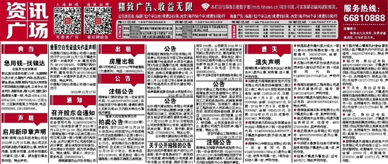 现对我司所管理的资产进行公开招租,资产信息具体如下:新民西73号房屋、新华南路20号房屋、新华北路43号房屋、海侨花园101房及106房。公告期自2022年12月17日至23日,本次房屋招租采用面议竞谈的方式,意向承租方可前往我公司洽谈。联系地址:海口市龙华区海秀中路84号海口市龙华数字经济产业园三号楼101室。联系人及电话:王先生,18689523302。