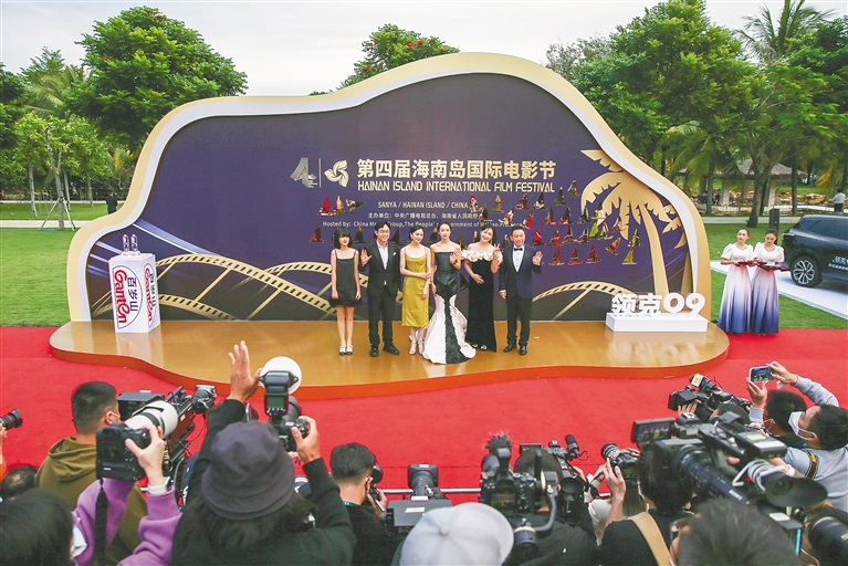 12月17日,第四届海南岛国际电影节开幕式红毯仪式在三亚举行。图为《保你平安》剧组成员亮相红毯仪式。本报记者 王程龙 摄(相关报道见A08/09版)