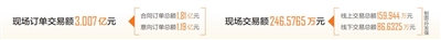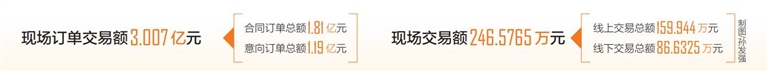 12月17日当天,冬交会现场交易额246.5765万元,其中线上交易总额159.944万元,线下交易总额86.6325万元;冬交会现场订单交易总额3.007亿元,其中合同订单总额1.81亿元,意向订单总额1.19亿元;冬交会项目签约数2个,项目签约金额为183.15亿元;冬交会现场人流量超2万人次。