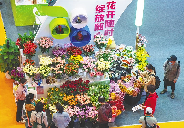 2022年冬交会现场,各色鲜花缤纷多彩,吸引顾客驻足欣赏。