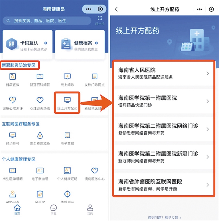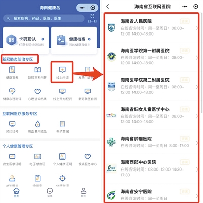 本报海口12月17日讯(记者马珂)12月17日,海南日报记者从省卫生健康委员会获悉,为满足群众新冠肺炎医疗咨询需求,该委以“海南健康岛”微信小程序为便民服务入口,推出了“新冠肺炎防治专区1.0”。主要整合医院现有的“互联网+医疗健康”便民服务,搭建健康宣教、新冠百科智能问答、线上问诊、发热门诊网点、线上开方配药、新冠就医自测等多种新冠疫情线上便民服务,为居民提供在线健康宣教和评估服务,为有需求的重点人群提供在线诊疗咨询服务。受新冠疫情影响,各地出现线下就诊人员聚集、候诊时间长,造成交叉感染等情况。