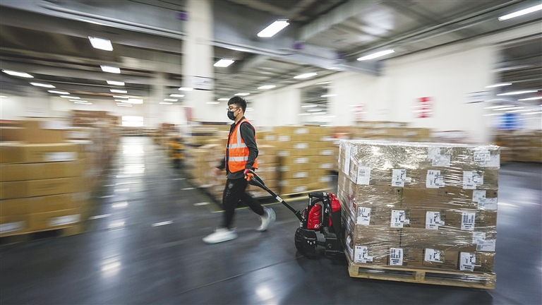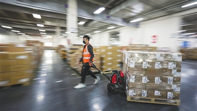 这是一个投用不久的免税品仓库,cdf海口国际免税城里的离岛免税商品,正是在这里获得“通行证”,完成走向柜台的“关键一步”。