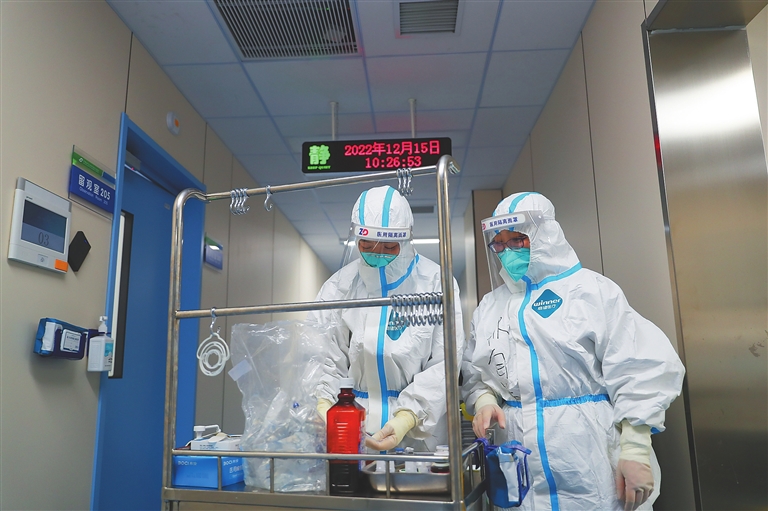 12月15日,在中国医科大学附属盛京医院南湖院区发热门诊,值班护士在给患者配药。