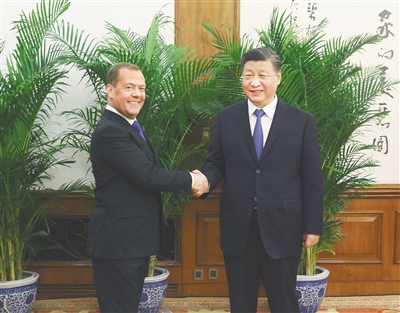 梅德韦杰夫首先转交普京总统致习近平主席的亲署信,转达普京对习近平的友好问候和美好祝愿。