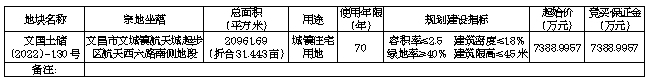 二、开发建设要求:(一)竞得土地后,竞得人须按照签订的《成交确认书》约定与文昌市自然资源和规划局签订《国有建设用地使用权出让合同》,在签订《国有建设用地使用权出让合同》之日起30日内付清全部土地出让价款。(二)市场化商品住宅套型建筑面积不低于100平方米,实行全装修和采取装配式建筑的方式建造。(三)市场化商品住宅项目需严格按照《海南省人民政府关于加强新建住宅小区配套公共服务设施建设管理的意见》(琼府〔2017〕96号)要求,配套建设教育、医疗卫生、商业服务、文化体育等公共服务设施和水、电、路、气、光等“五网”基础设施。配套的基础设施和公共服务设施要与主体工程同步规划、同步建设、同步验收、同步交付使用。(四)本次出让宗地属城镇住宅项目用地,竞得人须严格按照批准的项目规划设计方案要求,以及有关部门的行业规定,在五个月内动工建设项目,两年内完成建设验收并达到房源交付条件,五年内全面完成整宗地块开发。不按批准的项目规划设计要求进行开发建设,以及不履行《国有建设用地使用权出让合同》约定的,报经市政府批准后,按该合同约定,退还除该合同约定的定金以外的全部或部分国有建设用地使用权出让价款(不计利息),收回国有建设用地使用权;受让人造成土地闲置,按照《海南自由贸易港闲置土地处置若干规定》执行。(五)本次出让宗地按净地条件出让,即土地权利清晰、安置补偿落实到位、地上附着物清表、无法律经济纠纷、土地开发利用规划条件明确,符合海南省政府(琼府〔2018〕3号)文件规定具备动工开发所必需条件。竞买人应当现场踏勘出让地块,竞买人申请参加竞买的,视为对出让地块的净地条件无异议,在竞得土地后,竞得人须同意与出让人按该净地条件签订《国有建设用地交地确认书》确认出让地块交地开发建设。(六)按照《关于印发〈海南省建设用地出让控制指标(试行)〉的通知》(琼国土资规〔2018〕7号)和《关于实施产业项目发展和用地准入协议的指导意见》(琼国土资规〔2018〕8号)有关规定,本次出让宗地城镇住宅用地控制指标,投资强度为不低于500万元/亩,不设定年度产值指标和年度税收指标,开发建设的项目产值和税收征缴按照现行有关法规政策规定执行,达产年限5年。以上控制指标及要求按规定列入《产业项目发展和用地准入协议》(文国土储〔2022〕-130号),属于协议内容的组成部分,竞得人在签订国有土地使用权出让合同时,一并与文昌国际航天城管理局签订《产业项目发展和用地准入协议》(文国土储〔2022〕-130号)。(七)竞得土地后,竞得人拟在文昌国际航天城起步区注册成立新公司进行开发建设的,申请人应在申请书中明确新公司的出资构成、成立时间等内容。(八)竞得土地后,竞得人须按规定完善该宗地施工报建、地质、压覆矿、消防、环保等审批手续,方可动工建设。(九)根据《文昌市住房和城乡建设局关于文国土储〔2022〕-130号地块建设项目装配式建造意见的复函》,该宗地的竞得方须采用装配式方式建造。(十)该宗地实行现房销售制度,按《商品房销售管理办法》(原建设部令第88号)有关规定执行。