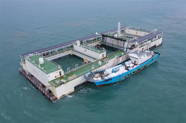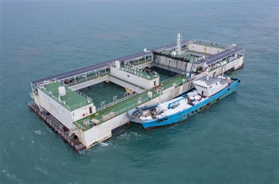 热闹的乐东黎族自治县龙栖湾,海南首座半潜式深远海智能养殖旅游平台“普盛海洋牧场1号”,经过7个月的深海养殖,迎来约75万斤军曹鱼的丰收。