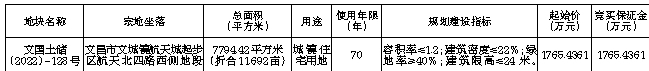 二、开发建设要求:(一)竞得土地后,竞得人须按照签订的《成交确认书》约定与文昌市自然资源和规划局签订《国有建设用地使用权出让合同》,在签订《国有建设用地使用权出让合同》之日起30日内付清全部土地出让价款。(二)市场化商品住宅套型建筑面积不低于100平方米,实行全装修和采取装配式建筑的方式建造。(三)市场化商品住宅项目需严格按照《海南省人民政府关于加强新建住宅小区配套公共服务设施建设管理的意见》(琼府〔2017〕96号)要求,配套建设教育、医疗卫生、商业服务、文化体育等公共服务设施和水、电、路、气、光等“五网”基础设施。配套的基础设施和公共服务设施要与主体工程同步规划、同步建设、同步验收、同步交付使用。(四)本次出让宗地属城镇住宅项目用地,竞得人须严格按照批准的项目规划设计方案要求,以及有关部门的行业规定,在五个月内动工建设项目,两年内完成建设验收并达到房源交付条件,五年内全面完成整宗地块开发。不按批准的项目规划设计要求进行开发建设,以及不履行《国有建设用地使用权出让合同》约定的,报经市政府批准后,按该合同约定,退还除该合同约定的定金以外的全部或部分国有建设用地使用权出让价款(不计利息),收回国有建设用地使用权;受让人造成土地闲置,按照《海南自由贸易港闲置土地处置若干规定》执行。(五)本次出让宗地按净地条件出让,即土地权利清晰、安置补偿落实到位、地上附着物清表、无法律经济纠纷、土地开发利用规划条件明确,符合海南省政府(琼府〔2018〕3号)文件规定具备动工开发所必需条件。竞买人应当现场踏勘出让地块,竞买人申请参加竞买的,视为对出让地块的净地条件无异议,在竞得土地后,竞得人须同意与出让人按该净地条件签订《国有建设用地交地确认书》确认出让地块交地开发建设。(六)按照《关于印发〈海南省建设用地出让控制指标(试行)〉的通知》(琼国土资规〔2018〕7号)和《关于实施产业项目发展和用地准入协议的指导意见》(琼国土资规〔2018〕8号)有关规定,本次出让宗地城镇住宅用地控制指标,投资强度为不低于240万元/亩,不设定年度产值指标和年度税收指标,开发建设的项目产值和税收征缴按照现行有关法规政策规定执行,达产年限5年。以上控制指标及要求按规定列入《产业项目发展和用地准入协议》(文国土储〔2022〕-128号),属于协议内容的组成部分,竞得人在签订国有土地使用权出让合同时,一并与文昌国际航天城管理局签订《产业项目发展和用地准入协议》(文国土储〔2022〕-128号)。(七)竞得土地后,竞得人拟在文昌国际航天城起步区注册成立新公司进行开发建设的,申请人应在申请书中明确新公司的出资构成、成立时间等内容。(八)竞得土地后,竞得人须按规定完善该宗地施工报建、地质、压覆矿、消防、环保等审批手续,方可动工建设。(九)根据《文昌市住房和城乡建设局关于文国土储〔2022〕-128号地块建设项目装配式建造意见的复函》,该宗地的竞得方须采用装配式方式建造。(十)该宗地实行现房销售制度,按《商品房销售管理办法》(原建设部令第88号)有关规定执行。