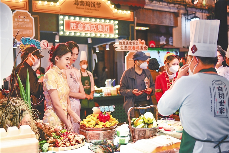 十二月二十三日晚,二〇二二年(第二十三届)海南国际旅游岛欢乐节在海口骑楼老街正式开幕。作为本届欢乐节主会场,海口今年推出首届海南鸡饭节等五项配套活动,趣味十足。图为海南鸡饭节活动现场。