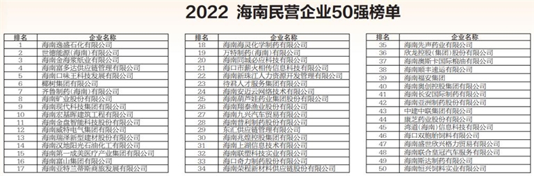 2022年,海南省工商联继续参照全国工商联开展中国民营企业500强的评选办法,以企业2021年度营业收入为指标排序,坚持民营企业自愿参与原则,广泛发动和组织全省营业收入超过1亿元的民营企业参与申报,经第三方评估机构对企业的申报材料进行审核后,发布“2022海南民营企业50强榜单”。同时为引导和鼓励民营企业创新发展,海南省工商联、海南省科技厅在2022海南民营企业50强排序申报的基础上,共同发布了“2022海南民营企业研发投入20强”榜单。
