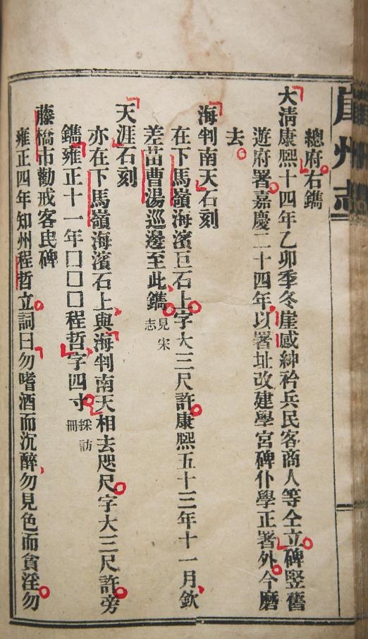 在现存康熙朱批奏折和兵部咨文等历史文献记载中,可以找到苗受、绰尔代、西洋人汤尚贤三人奉命前往江西、广东、广西等地进行地理测绘的史实。乾隆二十年成书的《崖州志》中,有这样的记载:“京差苗曹汤三大人巡边至儋州。”附注:“大人至州东下马岭海边刻‘海判南天’四大字于石。”