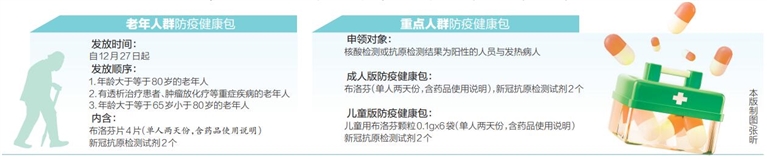 老年人群防疫健康包发放时间自12月27日起。每个防疫健康包含布洛芬片4片(单人两天份退烧药,含药品使用说明),新冠抗原检测试剂2个。