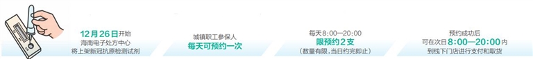 据介绍,从2022年12月26日开始,海南电子处方中心将上架新冠抗原检测试剂,海南城镇职工参保人通过海南电子处方中心每天可预约一次,每天8:00—20:00限预约2支(数量有限,当日约完即止)。预约成功后,可在次日8:00—20:00内凭预约信息和医保电子凭证到线下门店进行支付和取货。