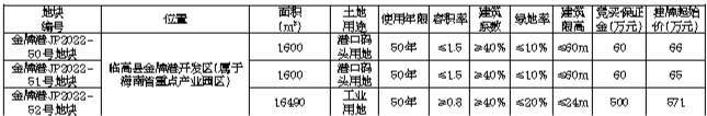 二、本次挂牌出让设有底价,按照出价最高且不低于底价者得的原则确定竞得人。 三、开发建设要求:(一)金牌港JP2022-50号和金牌港JP2022-51号地块拟作为金牌港开发区码头配套设施项目使用;金牌港JP2022-52号地块拟作为低碳园区配套产业项目使用,出让地块须统一规划、统一开发,建设须符合《海南临高金牌港经济开发区控制性详细规划》要求,生产配套满足规划要求,厂房风貌满足规划要求。(二)竞得人须在签订《挂牌出让成交确认书》后,5个工作日内金牌港JP2022-50号和金牌港JP2022-51号地块竞得人与临高县交通运输局签订《海南省产业项目发展和用地准入协议》;金牌港JP2022-52号地块竞得人与临高县工业和信息化服务中心签订《海南省产业项目发展和用地准入协议》,20个工作日内与临高县自然资源和规划局签订《国有建设用地使用权出让合同》,并严格按照约定内容进行开发建设,否则将承担相关违约责任。(三)竞得人出资比例结构、项目公司股权结构未经土地所在地人民政府批准不得发生变动。(四)竞得人取得土地使用权后,应依法建设使用土地和管理土地,切实履行《国有建设用地使用权出让合同》中的权利和义务。四、竞买申请:(一)竞买人资格:1.中华人民共和国境内外的法人、自然人或其他组织(法律另有规定者除外)均可申请参加竞买(注:失信被执行人不得参加本次竞买),申请人应单独申请,不接受联合体竞买。2.经政府相关部门核实,存在下列情形之一的,申请人及其控股股东禁止参加竞买:(1)存在伪造公文骗取用地和非法倒卖土地等犯罪行为的;(2)存在非法转让土地使用权等违法行为的;(3)因企业原因造成土地闲置一年以上的;(4)拖欠土地出让金的。(二)本次挂牌出让的详细信息和具体要求,见挂牌出让手册及其他相关文件。手册和文件可从海南省建设用地使用权和矿业权网上交易系统(以下简称网上交易系统,网址:http://lr.hainan.gov.cn:9002)查看和打印。(三)本次交易活动竞买申请环节采取线下方式进行,有意向的竞买人按挂牌出让手册的具体要求报名参加竞买。不接受电话、邮寄、口头等其他形式的申请。竞买申请地点:临高县自然资源和规划局办公楼212室。竞买申请时间: 2022年12月26日09:30至2023年2月1日17:00(北京时间)。(四)竞买人须按照挂牌出让手册的有关规定向指定账户足额缴存竞买保证金或使用银行保函方式提供竞买保证金。缴存竞买保证金的币种为人民币,不接受外币,且不属于银行贷款、股东借款、转贷和募集资金所得,并出具承诺。使用银行保函方式提供土地竞买保证金的,保函应为不可撤销、见索即付保函,担保金额应不少于全额土地竞买保证金,保证期限自保函开立之日起至挂牌交易活动结束后不少于60日;纸质保函需在竞买保证金到账截止时间前2个工作日送达,竞得土地后按规定支付土地出让金。竞买保证金到账截止时间为:2023年2月1日17:00(北京时间)。(五)经审核,竞买申请人符合竞买资格,且竞买保证金已按要求交纳的,临高县自然资源和规划局将发放《竞买资格确认书》,确认其获得竞买资格。竞买资格审核时间:2023年2月1日17:30(北京时间)。 五、挂牌报价时间及地点:(一)获得竞买资格的竞买人应按挂牌出让手册的具体要求参与报价竞价活动。挂牌报价阶段仅接受书面报价,不接受电话、邮寄、电子、口头等其他方式报价。(二)挂牌报价时间:2023年1月16日09:30至2023年2月3日09:30(北京时间),受理报价时间为北京时间工作日08:30至11:30及14:30至17:00。(三)挂牌报价地点:临高县自然资源和规划局办公楼212室。(四)挂牌现场会地点:海南省公共资源交易服务中心二楼土地矿产资源交易厅(203室)。六、其他事项:(一)土地出让控制指标:上述地块投资强度不低于200万元/亩,年度产值不低于300万元/亩,年度税收不低于15万元/亩,金牌港JP2022-50号和金牌港JP2022-51号地块达产时间为2024年12月31日;金牌港JP2022-52号地块达产时间为土地合同签订后4年内。(二)该地块安置补助费均已落实到位,地上附着物已清表,土地权利清晰,无法律经济纠纷;不存在土壤污染,符合土壤环境质量要求;宗地已基本完成土地平整,地块周边可以满足施工建设所需的水、电供应,相关设备、机械可以进场施工,具备动工开发必需的条件。(三)成交价款不含各种税、费、挂牌服务费,均按有关规定另行收取。(四)本次挂牌出让事项如有变更,届时以变更公告为准。(五)本公告未尽事宜详见《临高县国有建设用地使用权挂牌出让手册》,该手册所载内容为本公告的组成部分。七、咨询方式:联系方式:周女士 18976947136;查询网址:http://zw.hainan.gov.cn/ggzy/;http://lr.hainan.gov.cn;http://lr.hainan.gov.cn:9002/。