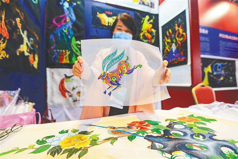 针下飞彩,锦上生花的秦绣引领你领略千古流传的古都传奇;“海上丝路”文化展展出非遗瑰宝,唤醒文化记忆;配色大胆的彩雕画用新颖、集趣的视觉语言,全方位展示海南的热带风土人情;西安唐明时期文物文创、雪域高原的尼木三绝以及“最忆是杭州”等特色文化产品尽显民族特色。随处可见的中国风元素,让观者在熙熙攘攘的会馆中,无论走到哪儿,都可尽享文化大餐,领略中华文化之美。