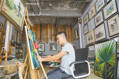 这里也是屯昌油画的“生产车间”。48名画师以家庭作坊的形式经营着画室,并带动110名画工参与生产。