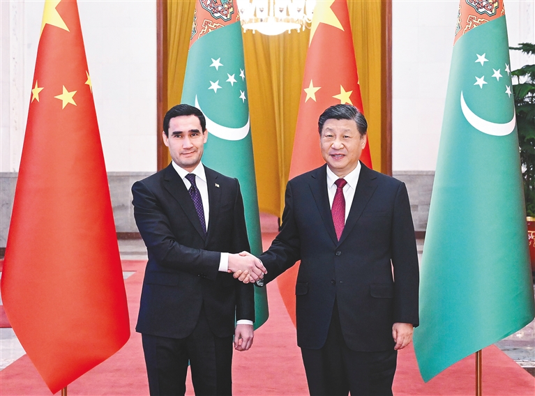 习近平指出,这是你就任总统后首次访华,今天又是中土建交纪念日,我们全面谋划中土关系下一步发展,共同宣布将两国关系提升为全面战略伙伴,意义重大。中国共产党正在团结带领全国各族人民以中国式现代化全面推进中华民族伟大复兴,土方正在积极推进土库曼斯坦复兴战略。中土两国理念相通,目标相似,利益相连,在发展振兴路上要携手努力,发挥互补优势,深挖合作潜力,实现共同发展。中方愿同土方一道,持续深化中土全方位合作,推动构建中土命运共同体,使两国关系在更高水平上向前发展。