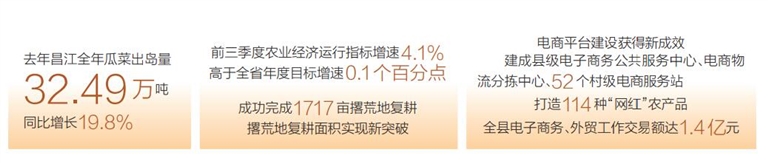 乡村产业发展和农民增收方面。昌江巩固乡村产业发展新成效,认证5个“两品一标”产品、建成5个省级现代农业产业园,创成“霸王岭山鸡”“昌江芒果”国家地理标识品牌,扶持打造5个“一村一品”特色产业村、1个特色产业小镇和57个美丽乡村,十月田镇好清村连续两年上榜“全国乡村特色产业亿元村”;稳步提升农村人均可支配收入增速,大力推进产业、就业工作,加快落实各项惠农补贴发放,实现2022年前三季度农民收入增速5.5%,高于全省平均水平0.3个百分点。