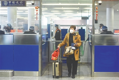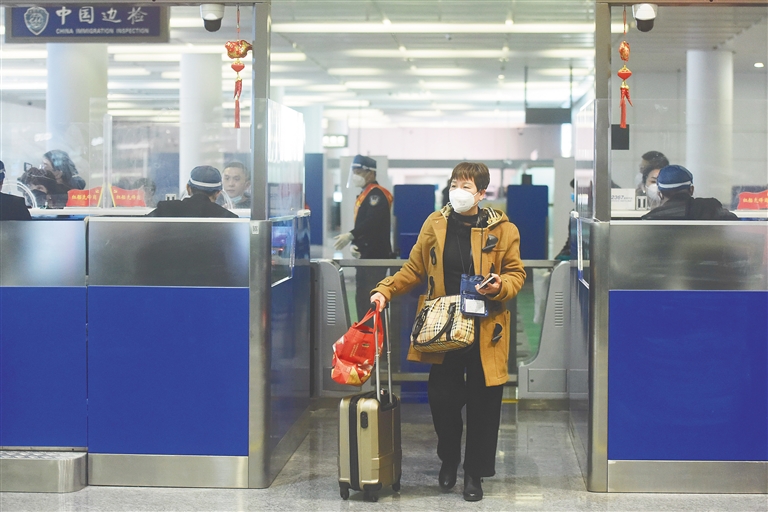 1月8日,新型冠状病毒感染回归乙类管理。杭州出入境边防检查站多措并举保障口岸通关。图为乘坐国际航班的旅客通过萧山国际机场边检站入境。