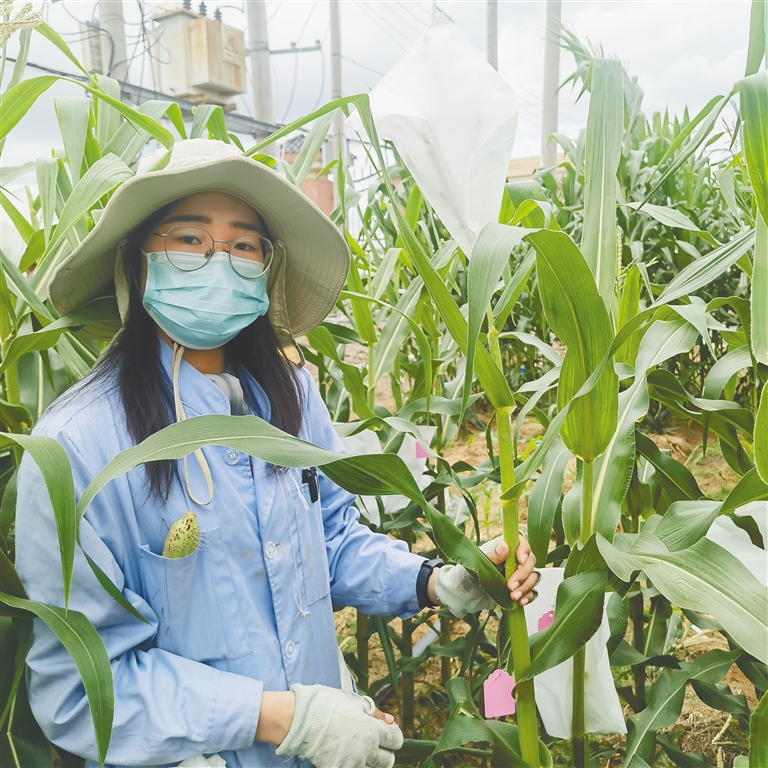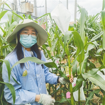 抬手、剪花,手起刀落间,一株玉米的雄花落到手中,抖动白色套袋,雄花花粉纷纷掉落袋中。接着取下雌花上的套袋,将花粉注入花丝上,再将套袋套回。不到一分钟,一株试验玉米材料的人工授粉便已完成。这样的操作,孙茜最多一天重复500次。