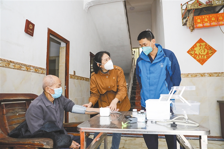 1月10日,在琼中黎族苗族自治县黎母山镇新林村,驻村第一书记陈晓玲(中)和黎母山镇卫生院院长陆勤波一同巡诊。
