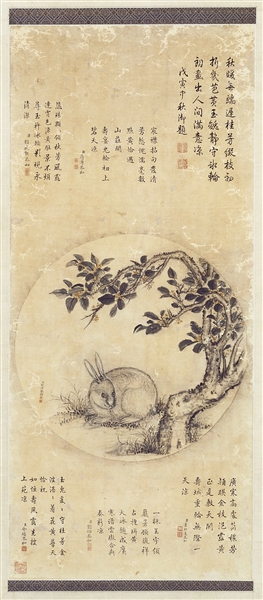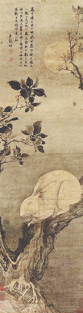 玉兔,月亮的代称,传说嫦娥奔月带走了玉兔。嫦娥的故事最早出现在商朝卦书《归藏》,不过该书已佚失。现存最早记载“嫦娥奔月”的文献是成书于汉初的《淮南子》。最早提到月兔的是屈原的《天问》:“夜光何德,死则又育?厥利维何,而顾菟在腹?(此处‘菟’通‘兔’)”顾菟,月亮的别称。嫦娥奔月、玉兔捣药、吴刚伐桂等传说,给月亮增添了美丽而神秘的色彩,使玉兔与月亮联系起来。人们习惯用“兔月”指代农历八月,连闰八月都有了一个可爱的名字,叫“玉兔重生”。