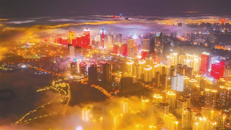 1月14日,夜幕降临,华灯初上,一场突如其来的大雾弥漫海口,雾里的“醉”美椰城景色尽收眼底,宛若仙境。本报记者 张茂 摄