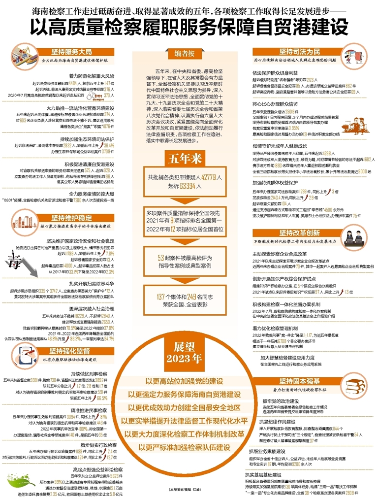 五年来,在中央和省委、最高检坚强领导下,在省人大及其常委会有力监督下,全省检察机关坚持以习近平新时代中国特色社会主义思想为指导,深入贯彻习近平法治思想,全面贯彻党的十九大、十九届历次全会和党的二十大精神,深入落实省委七届历次全会和省第八次党代会精神,认真执行省六届人大历次会议决议,紧紧围绕海南全面深化改革开放和自贸港建设,依法能动履行法律监督职责,各项检察工作在稳进、落实中取得长足发展进步。
