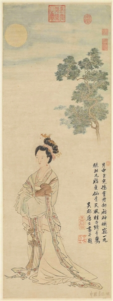 到唐宋时期,“玉兔捣药”“嫦娥奔月”等传说已在民间广为流传,月亮、嫦娥、吴刚、玉兔、桂树、蟾蜍的固定搭配深入人心。现藏于故宫博物院的唐代八瓣菱花形月宫镜,主题纹饰为月宫图,画面中有枝繁叶茂的桂树,还有挥袖起舞的嫦娥,正在捣药的白兔以及向上跳跃的蟾蜍。