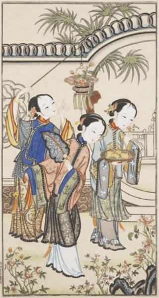 起源于宋代的桃花坞年画,随着江南经济的发展,在清代雍正、乾隆年间进入鼎盛期,一度与天津杨柳青遥相呼应,形成“南桃北柳”的年画发展格局。桃花坞年画受吴越文化的影响,风格雅致,极富文人气息。其中,仕女主题的年画最能体现桃花坞年画的风神。这类年画中的仕女大都有“鼻如悬胆,樱桃小口,柳叶眉,鹅蛋脸”的特征,是纤柔清秀的美人。在年画艺人的笔下,她们或从事纺织刺绣,或沉迷琴棋书画,或履行相夫教子的职责。我们透过一幅幅小小的年画,仿佛看见了清代江南女子优雅务实的一生。