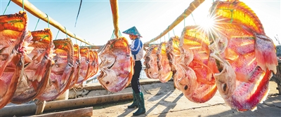 1月14日,在儋州市新州镇新英码头,渔民们正忙着腌制晾晒红鱼,筹备年货。